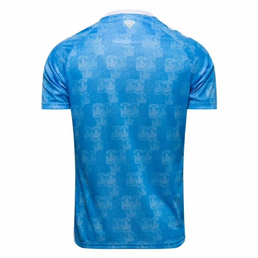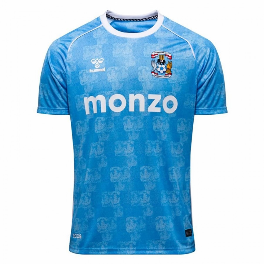 We wanted to keep this as a simple all Sky Blue. Based off a pixel stamp graphic that runs all over the kit. Essentially over a thousand crests have gone into creating the home kit in a modern way. The shirt features a polyester interlock fabric base, with an overlapping Coventry crest design. The crest is a woven flock quality, with contrast white sleeve piping detail, side mesh panels and chevrons running the sleeves with an authentic badge to finish. Each CCFC shirt is made from Eco8 material. It's a high-tech polyester that's truly innovative because it's made from up to 8 recycled plastic bottles. This ensures you're wearing a kit that looks sharp, performs well, and supports the planet.